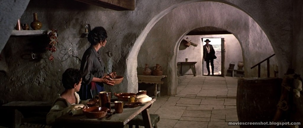 Doorways and the general crossing of thresholds are a major theme within this picture. As Ethan had been wandering for three years after the surrender of the Confederate States, he’s effectively reentering society for the first time by crossing through the doorway into the Edwards’ home. Ethan shows up with freshly minted coins, and a medal from his service in the Second Franco-Mexican war. A later statement from the Reverend and Ranger Captain Clayton implies that Ethan wasn’t even present at the Confederate surrender. These elements establish Ethan as a deeply traditional man, stuck in his ways and too stubborn to accept any new development or growth.