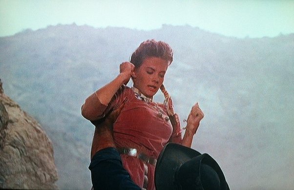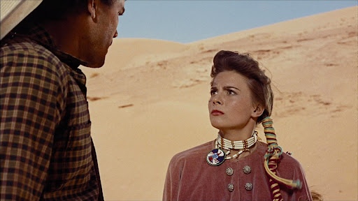 But we find out about this ordeal through a letter Marty has sent home to Laurie, his childhood sweetheart who’s romantic interest in him he’s fairly ignorant of. A later plot point in the film is Ethan and Marty breaking up Laurie’s wedding to Charlie McCory, a local guitar player and the one to deliver the letter to Laurie. But quantifying Marty’s relationship to these two women, Look was the one he had unintentionally married and didn’t end up with Laurie until the very last shot of the film. But with Marty being mixed, this is a way of him acting as that middle ground between the whites and the Natives. Additionally, the introduction as well as Marty’s mistreatment of Look for the most part acts as a sort of turning point for Ethan, where it seems like he’s starting to see the indigenous as human. He laughs at the situation of Look all of a sudden joining their group, but respectfully (albeit sarcastically) refers to Look as “Mrs. Pawley” and treats her as he would anyone else’s wife. He laughs when Marty kicks Look down a hill in frustration, but follows that up with the proclamation that that action would be grounds for divorce in Texas. Again, sarcastically but nevertheless acknowledging the abuse Marty has committed.