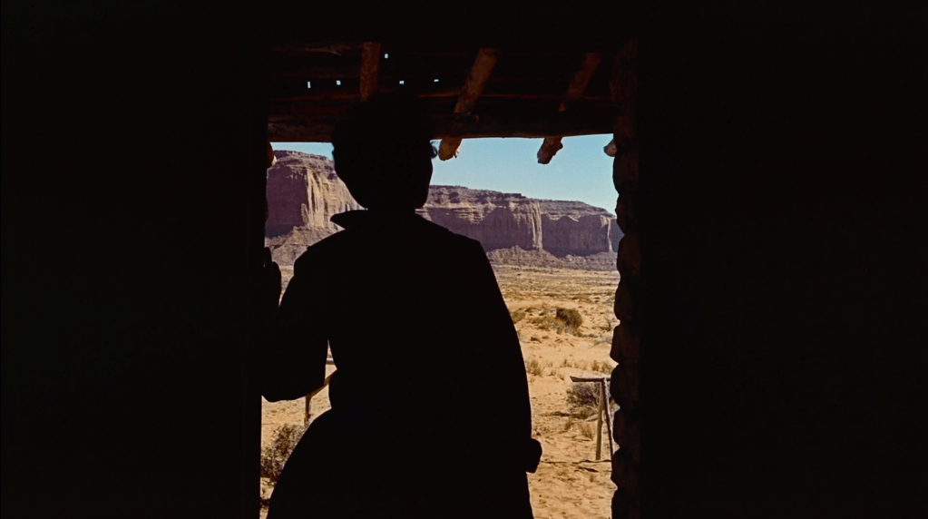 What John Ford sought to do with The Searchers was re-contextualize the myth of the American West, the self righteousness of the Manifest Destiny and the relations between the settlers and the Native American nations. What’s common in Westerns as well as the myth of the outlaw is that these figures were often Confederate soldiers after the conclusion of the Civil War. They felt that they had no place in the Union as well as the ever changing modern society. So they drifted, doing odd jobs going town to town to make a living. In the film, we first meet John Wayne’s character Ethan Edward’s riding up to his brother’s house, the camera shooting through a doorway to frame his introduction as the crossing of a threshold.