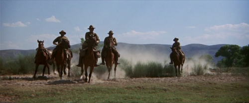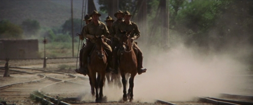 For once, Pike’s plan goes without a hitch. Thornton is sure that Pike would target the train, so he’s there with his gang as well as a battalion of “green recruits” from the Army. Close ups of these boys show that a majority of them barely seem past adolescence. Inexperienced and uneducated much to Thornton’s chagrin. Regardless, the Bunch mount and rob the locomotive, and unhitch it and the car carrying the weapons from the passenger compartments of the rest of the train. It’s not until the locomotive is well on its way that Thornton looks out the window and sees the successful robbery. He rallies his gang and they ride off after the Bunch, while the Army soldiers sit in the car unaware or simply asleep.
